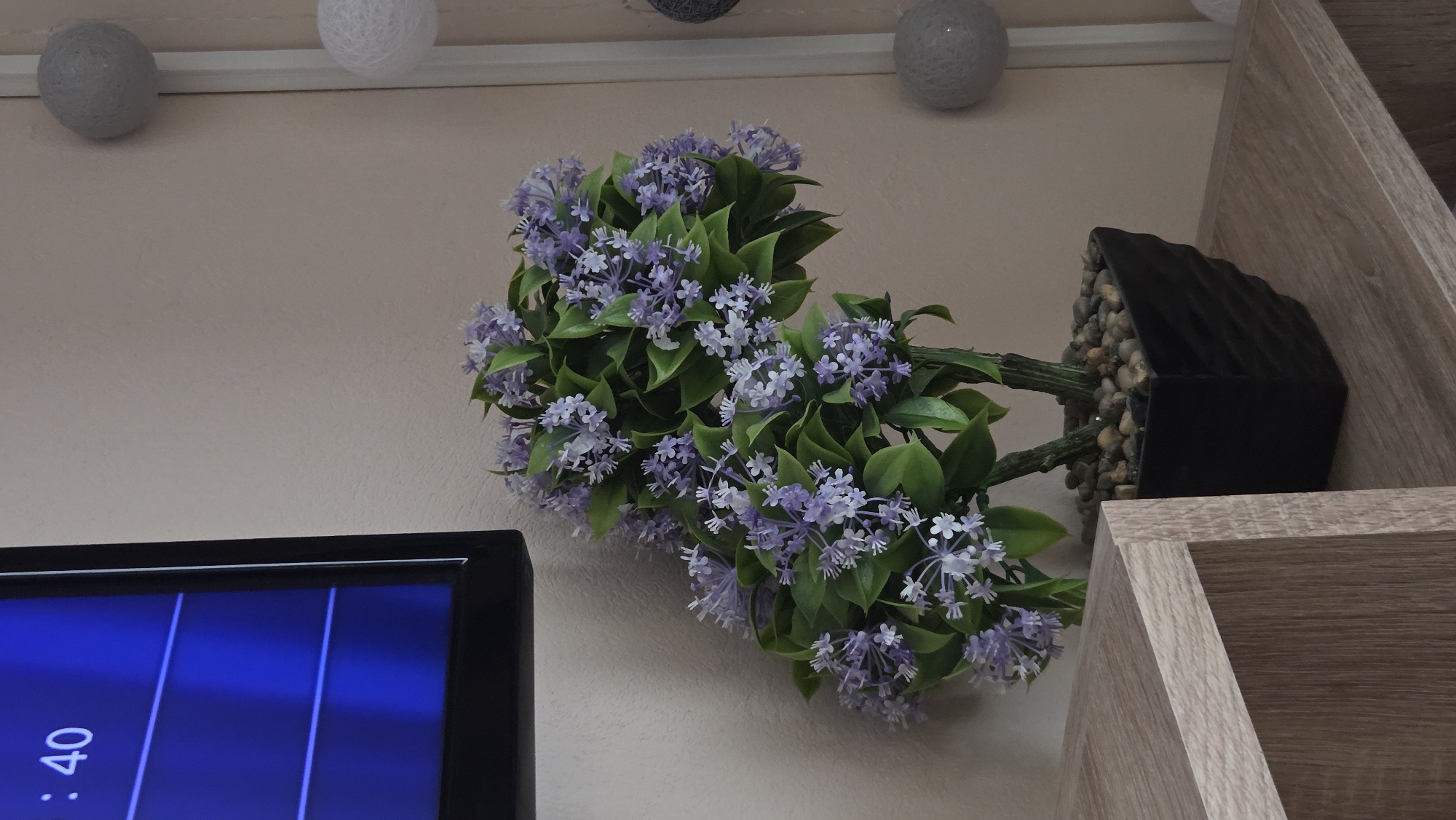 display in an interior space, likely a home. A black-framed television screen is visible in the lower left corner with a blue display. Next to it, a decorative artificial flower arrangement with lavender-colored flowers and green leaves is mounted on a light beige wall. The arrangement is in a black pot filled with pebbles, and the pot is placed on a shelf. Above the arrangement, there are spherical decorative objects attached to the ceiling. To the right of the flower arrangement, the edge of a light-colored, wooden-style shelving unit is visible. The image was likely taken indoors under artificial lighting. The location in Enina, Bulgaria is not ascertainable from this image.