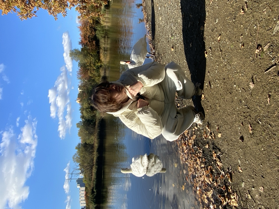 The image depicts an outdoor scene at a park or natural area adjacent to a residential zone in the Capital City of Prague, Czechia, during what appears to be autumn. A young adult individual with medium-length brown hair is shown in a low squatting position on a dirt bank, facing towards the right side of the frame and looking away from the camera. The person is wearing a light beige or off-white hooded puffer jacket, light-colored loose-fitting pants, and light-colored sneakers. Their hands are clasped together near their chest. To the left of the individual, a white swan floats in a calm body of water, facing away from the camera, with its reflection visible. To the right of the individual, another white swan is positioned partially in the water and partially on the bank, facing towards the left. The immediate foreground consists of a dirt bank covered with scattered dry brown and orange autumn leaves and small debris. The body of water occupies the midground, reflecting the clear blue sky. Across the water, a dense line of trees and bushes displays varied autumn foliage, including greens, yellows, oranges, and reds. In the far background, residential apartment buildings and high-voltage power lines are visible above the tree line. The sky is bright blue with scattered white cumulus clouds, and direct sunlight casts distinct shadows, indicating a sunny day, likely midday or early afternoon.
