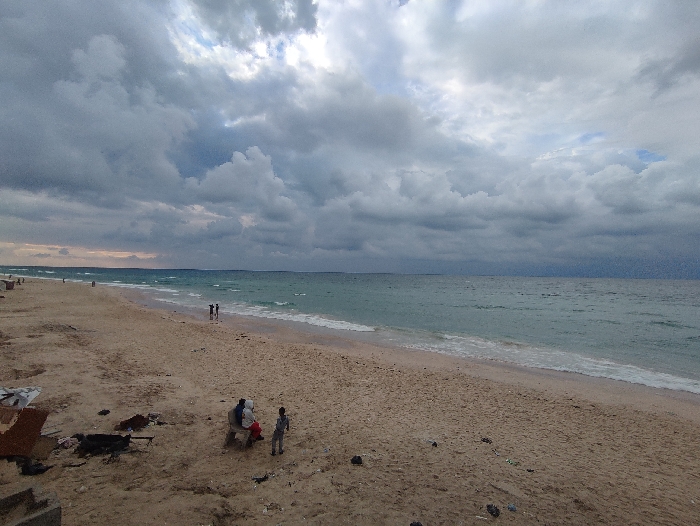 The scene depicts a wide sandy beach under a heavily overcast sky in Al-Mawasi, Unknown