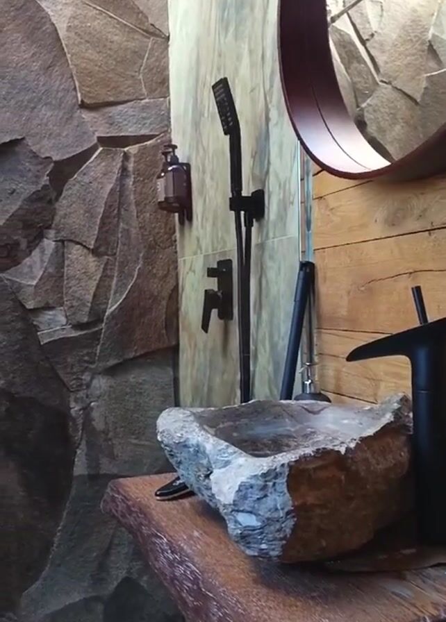 modern bathroom. The walls of the shower are made of large, irregularly shaped rocks, creating a rugged, natural aesthetic. A black shower head and faucet are mounted on the wall. A stone sink sits on a wooden countertop. A round mirror is mounted above the sink. A soap dispenser is also attached to the wall. The shower area is illuminated by a skylight above. There are no people visible in the video. The camera moves around the room to capture different angles of the bathroom.