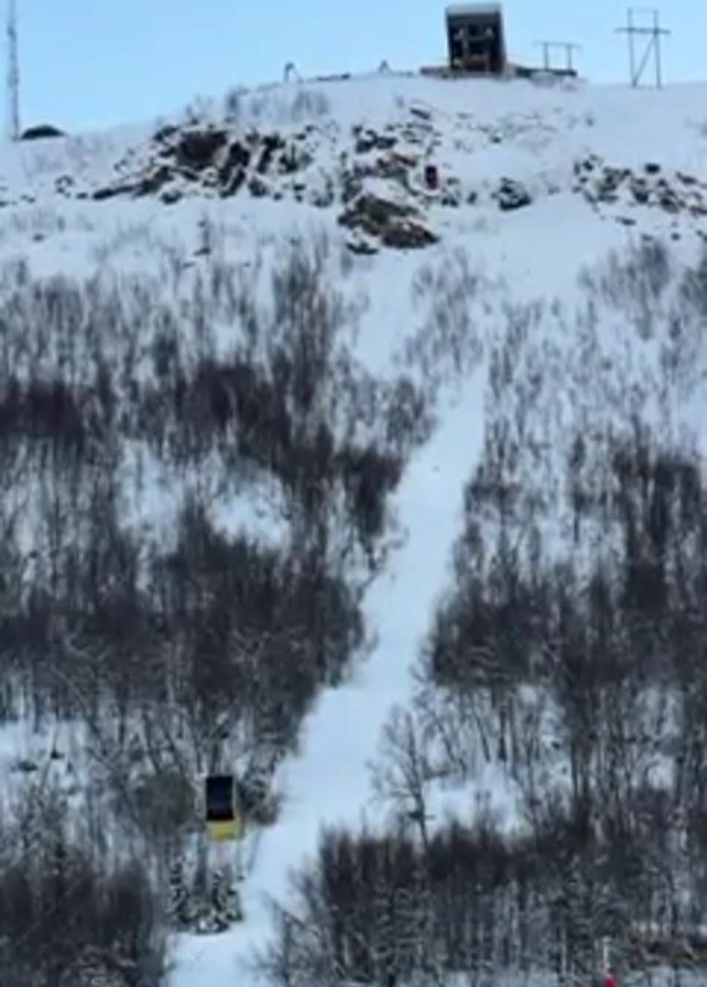 A long-shot video shows a yellow tram moving down a snowy mountain with sparse trees