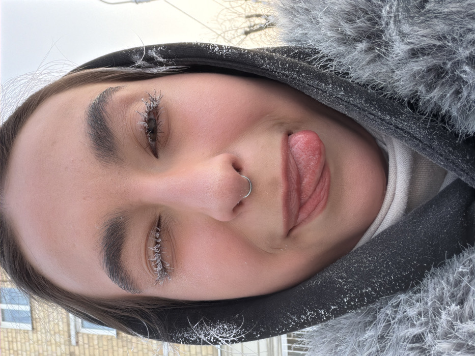 A close-up portrait shot features an individual, likely female, facing the camera outdoors in Krasnoyarsk, Russia, under conditions of extreme cold. The subject's eyelashes are heavily frosted with white ice crystals. Similar ice accumulation is visible on the dark fabric of their hood and the grey, fluffy material of an outer garment worn on the right side. The individual has dark hair partially visible and wears a silver septum ring. Their cheeks appear flushed, indicative of cold exposure. The subject is captured with partially closed eyes and their tongue extended and curled to the left side of their mouth, conveying a playful expression. In the left background, a light-colored, multi-story building with several windows is visible. The right background shows bare tree branches silhouetted against a bright, overcast sky, characteristic of a winter environment.