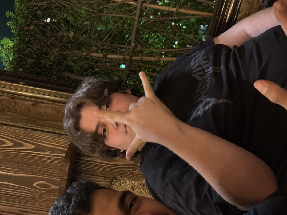 In a restaurant or café setting within the city of Rukn ad-Din Municipality, Syria, two individuals are depicted. A central figure, with light skin and shoulder-length, dark brown, wavy hair, is shown wearing a black short-sleeved t-shirt with a grey, stylized graphic text. This individual holds their right hand raised, forming a "rock on" gesture with the index finger and pinky extended, obscuring part of their face while looking forward. To the left, a second individual with darker skin and short, dark hair is partially visible, showing only their left eye and cheek. A thumb and index finger of this second individual are also visible in the bottom left foreground. The background features a wooden paneled wall on the left and a dense wall of green foliage on the right, indicating an outdoor or semi-outdoor area, with minimal, faint turquoise lighting suggesting nighttime. The scene is illuminated by warm, artificial light.