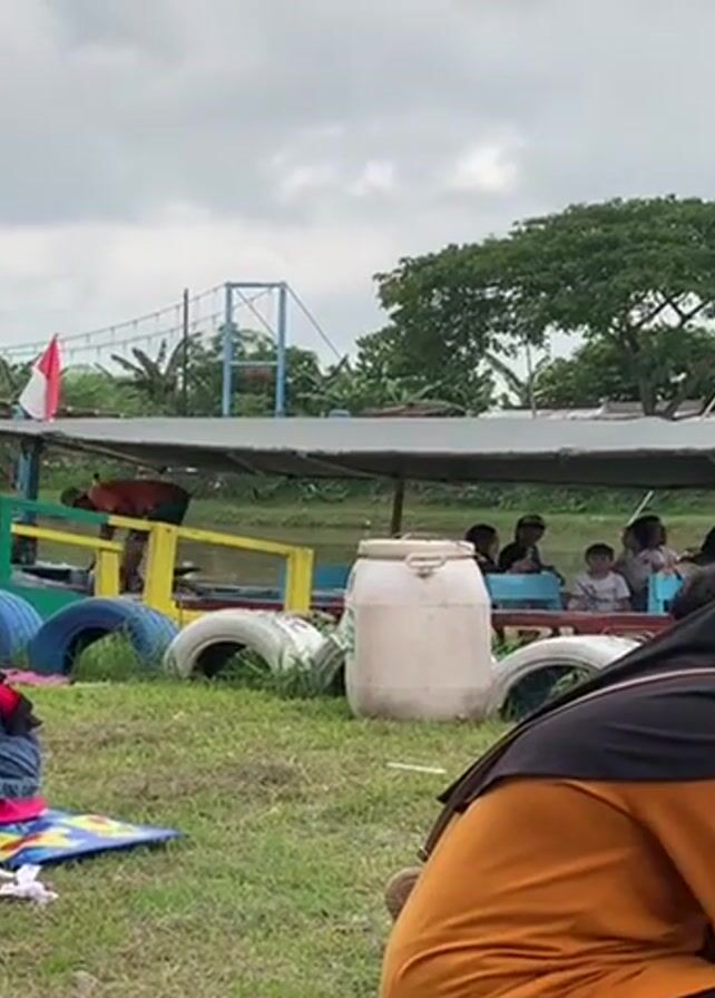 grassy area with people sitting and watching a small, covered boat on a river. The boat is decorated with colorful tires and has a white barrel on board. People are sitting at a table on the boat. A person in a red shirt is standing at the front of the boat, possibly preparing to depart. In the background, there is a bridge and trees. The sky is overcast. Other people are on the grass in the foreground.