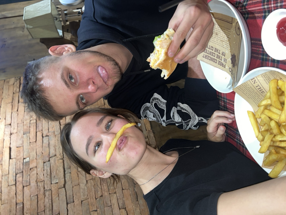 An indoor photograph, taken in a restaurant or cafe in Nha Trang, Vietnam, depicts two young individuals seated at a table with food. On the left, a female with light brown hair, wearing a dark short-sleeved top and a silver necklace, holds a single french fry positioned horizontally between her nose and puckered upper lip, simulating a mustache. Her gaze is directed towards the camera. On the right, a male with short light brown hair, wearing a black hooded sweatshirt with white serpentine designs on the sleeve, holds a partially eaten hamburger in his right hand. He looks towards the camera with his tongue extended. The table is covered with a red and green plaid tablecloth. In the lower left, a white bowl filled with french fries rests on a paper liner resembling newspaper print. A small white ramekin containing red ketchup is visible in the lower right. Another white bowl, containing a similar newspaper-print liner with text including "FREE CONCERT IN THE CENTER OF THE CITY," is near the male. The background features a textured wall composed of rectangular brown and tan bricks, with a lamp visible in the upper right.