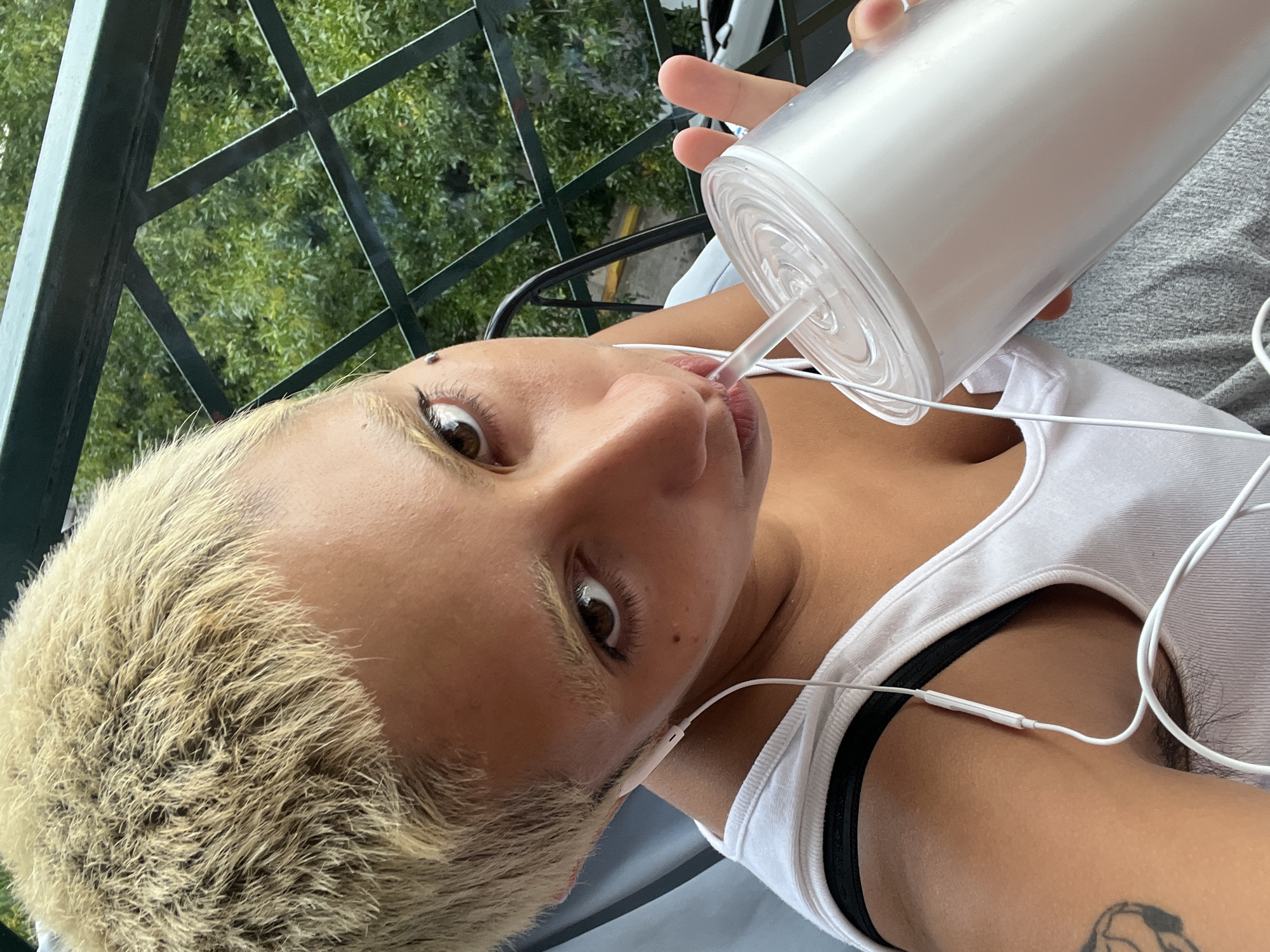 A person with short, bleached blonde hair and dark brown eyes is depicted in a close-up, selfie-style image. They are wearing a white ribbed tank top over a black bra. A small silver barbell piercing is visible above the outer corner of their right eyebrow, and a mole is present on their right cheek. White wired earbuds are visible, with the wire running down their chest. The person is actively drinking from a white plastic tumbler with a clear lid and straw, holding it with their left hand. A partial black tattoo is visible on their upper left arm. The scene is set outdoors, likely on a balcony, with a dark green metal railing prominent in the background. Beyond the railing, dense green foliage from trees is visible, with a blurred view of an urban street or ground level, including a white vehicle, in the distance. The location is the city of Buenos Aires, Argentina.