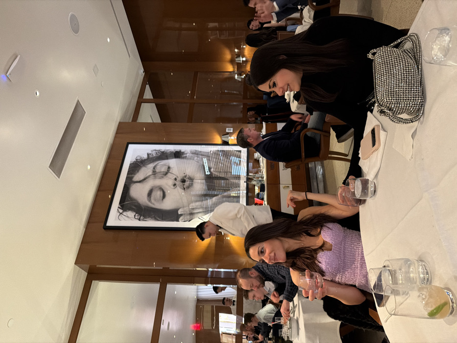 A group of people are seated at a long table covered with a white tablecloth in a restaurant. Some hold drinks. A woman in a black outfit sits at the head of the table. A large framed portrait hangs on the wall behind them. A waiter in a white shirt stands next to the portrait. Other people are visible in the background. The interior of the restaurant appears modern with dark wood paneling.