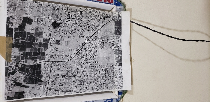 A black and white printed map, depicting an area within the city of Kandahar, Afghanistan, is secured vertically against a light-colored wall. The map illustrates a mixed landscape of densely packed urban structures, open terrain, and distinct rectangular plots, characteristic of cultivated fields. Several dark, winding lines, representing roads or waterways, are delineated across the map. Alphanumeric labels, including "02," "04," "22," "800," "D3," "003," and "004," are visible. A single strip of tan adhesive tape holds the map at its top center. To the map's right, a partial section of a multicolored poster featuring blue, red, and white is discernible. Directly beneath the map, a narrow white horizontal ledge or surface is present. A thin, dark, wavy line, likely a wire or cord, hangs vertically from below the map, casting a distinct shadow to its left on the wall.
