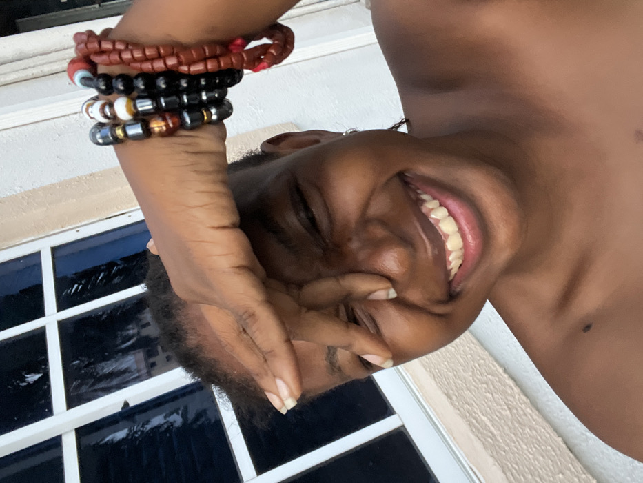 A dark-skinned individual is captured in a close-up, upside-down view, laughing heartily with their eyes closed and hand partially covering their face. The person is wearing several stacked beaded bracelets in shades of brown, black, white, and gold. The backdrop is blurry, revealing a window with multiple panes and a textured, light-colored wall. A mole is visible on the person's shoulder.