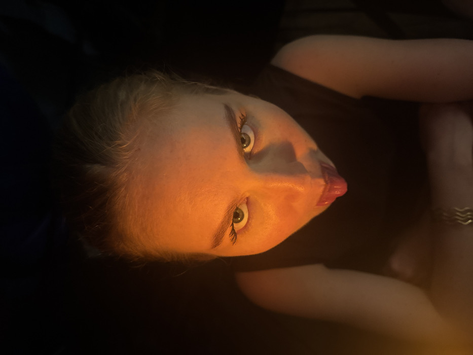 A woman with blonde hair, illuminated by a warm orange light, looks upward with wide eyes. Her lips are slightly parted and her tongue is visible. She is wearing a dark top. Part of an arm with a bracelet is visible in the lower right of the frame. The rest of the image is dark and out of focus.