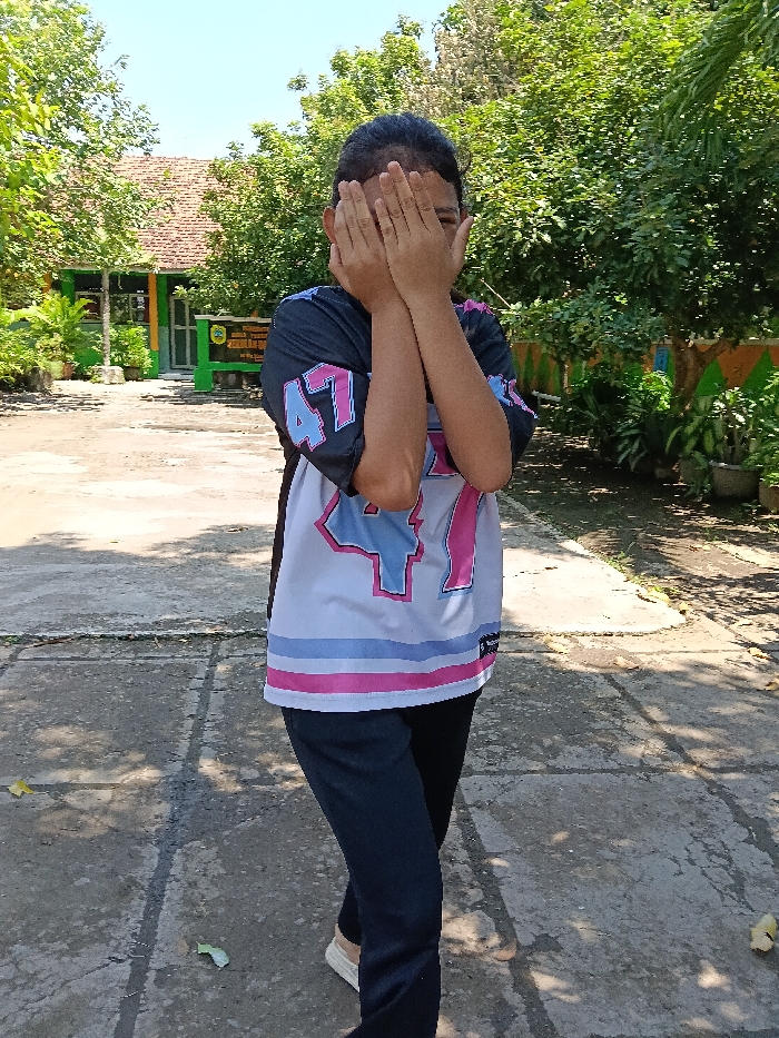 A person covers their face with their hands outdoors on a sunny day. They wear a jersey-style shirt with the number 47 and dark pants. A building and trees are in the background. The person stands on a paved area. Some fallen leaves are on the ground.