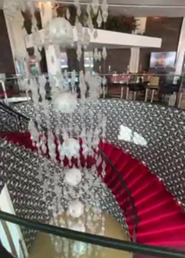 From a high vantage point, the camera captures an extravagant interior. The focal point is a large, elaborate chandelier composed of multiple spherical white orbs dripping with translucent, decorative elements. Beneath it, a spiral staircase covered in a vibrant red carpet ascends from a floor adorned with a black and white geometric pattern. The staircase culminates in a golden landing. In the background, beyond the staircase, there is a bar area with tables and chairs. A screen displays content on the back wall. The overall atmosphere is luxurious and modern.