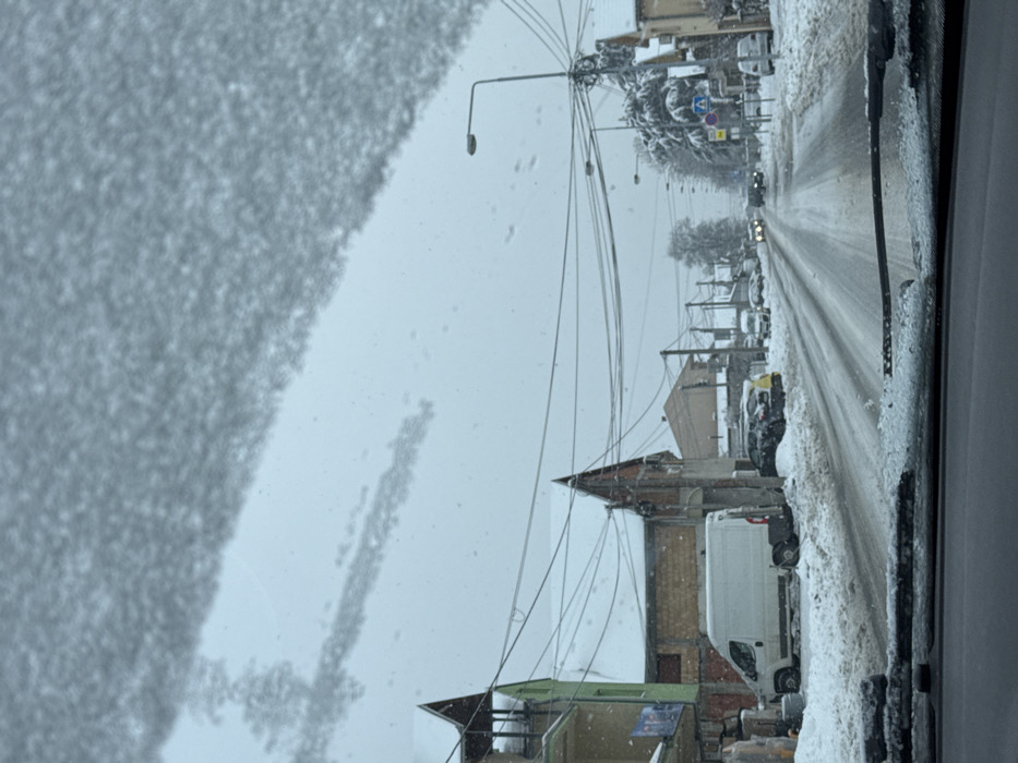 A snow-covered street, viewed through a car windshield, is the focal point. Heavy snow obscures part of the windshield. Buildings line the street, along with parked vehicles buried in snow. Overhead, utility poles and wires crisscross the sky. The road ahead is lined with piled snow and appears icy and slippery. A street lamp stands at the side of the road.