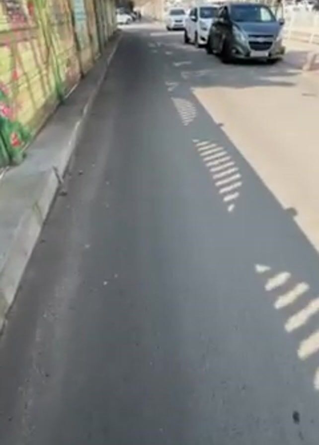 The video presents a forward-moving perspective along a narrow asphalt street or lane bordered by a concrete curb and a weathered wall adorned with vibrant mural art on the left, and parked cars and a sidewalk on the right
