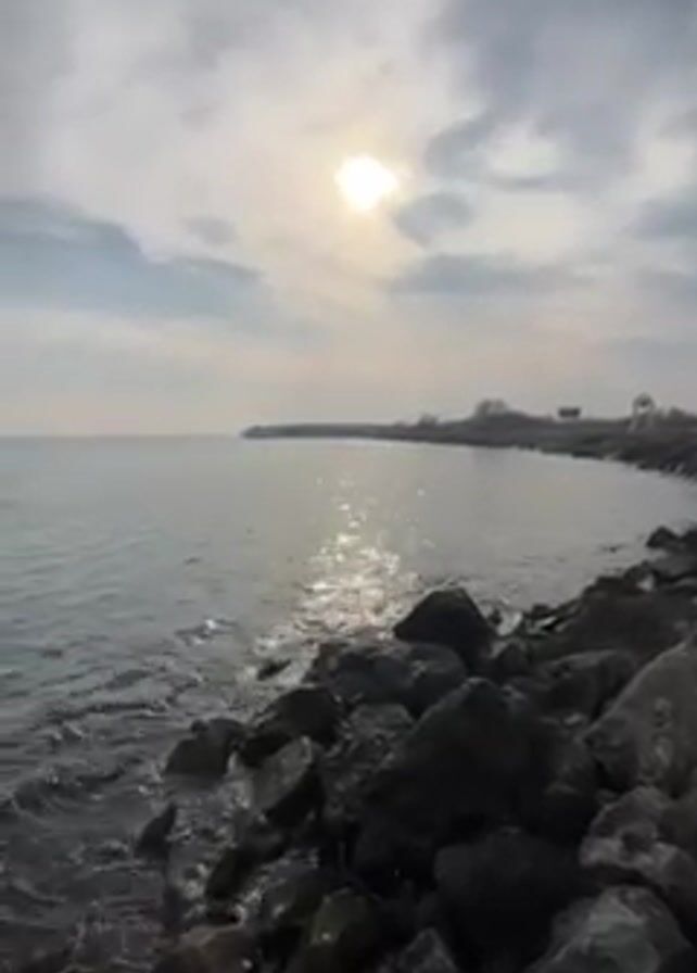rocky shoreline on a body of water under a cloudy sky with the sun visible behind the clouds. The water is calm with small waves lapping against the rocks. In the distance, land is visible. No people or animals are present. The camera moves slightly, showing more of the water and the shoreline.