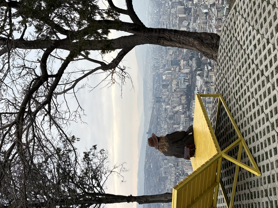 An individual is seated on a bright yellow, slatted outdoor lounge chair on a paved overlook, facing away from the camera and observing a panoramic view of the city of Tbilisi, Georgia