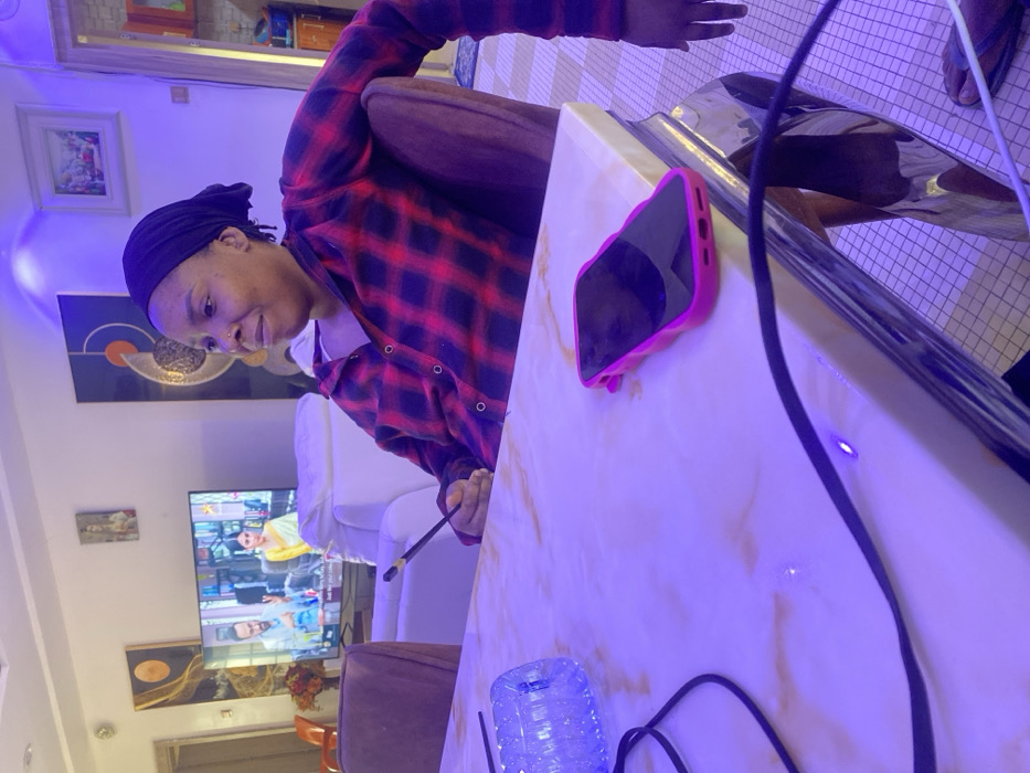 An adult female is seated at a light-colored, veined dining table in an interior residential space within Giginyu, Nigeria. She wears a black head covering and a red and black plaid shirt, unbuttoned at the collar. Her left hand holds a thin, dark stick-like object, possibly a brush or pen, resting on the table. A smartphone in a bright pink case lies face down on the table to her right. A clear plastic bottle and dark cables are also on the table. She is looking towards the right with a slight smile. In the background, a large flat-screen television displays a scene with two individuals from an entertainment program, positioned in front of a white sofa. The room features multiple framed artworks on the wall, including abstract pieces and a smaller religious image. Recessed lighting casts a purple hue throughout the space, which has light-colored tiled flooring.