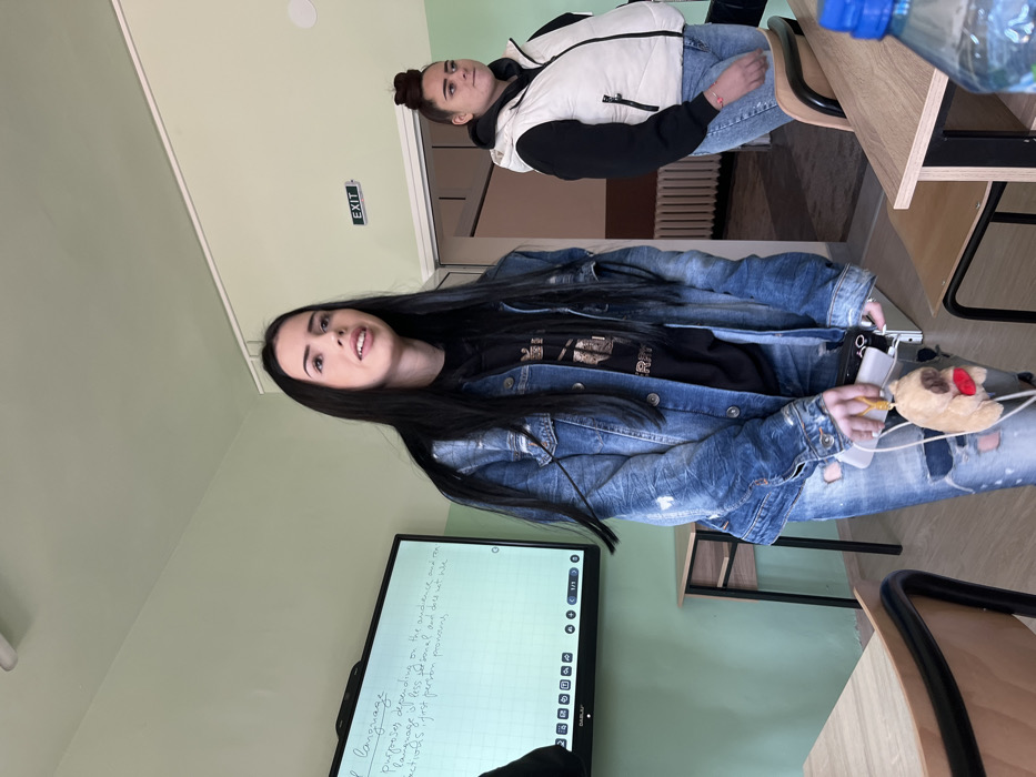A classroom in Bankya, Bulgaria, is depicted with two young adult females and educational implements