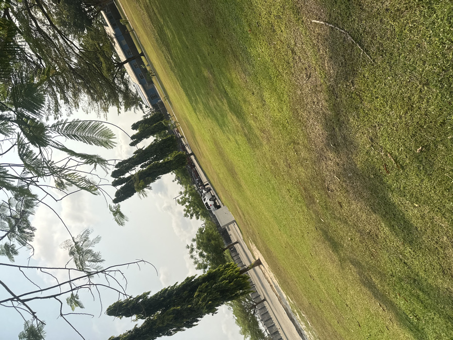 The image displays an outdoor scene in Ozuaha, Nigeria, characterized by a large, predominantly green grassy expanse under a bright sky with scattered white clouds. The foreground and midground consist of a mown lawn, showing variations in grass color from vibrant green to drier, lighter patches, with a few small twigs visible on the surface. Distinct shadows are cast across the grass, suggesting direct sunlight. Diagonally across the midground, a paved road or parking area is visible. Along this pavement, a row of tall, slender, dark green columnar trees stands upright. Several vehicles are parked on or adjacent to this paved area, including a prominent white pickup truck and other darker-colored automobiles. A street light pole is also present near the vehicles. In the far background, a long, single-story building with a light blue or grey roof and light-colored walls is situated on a further grassy plain. Additional trees, some with dense green foliage and others appearing less dense, are visible throughout the background. Overhanging branches with green leaves partially frame the top of the image. No individuals or specific human activities are clearly discernible within the frame.