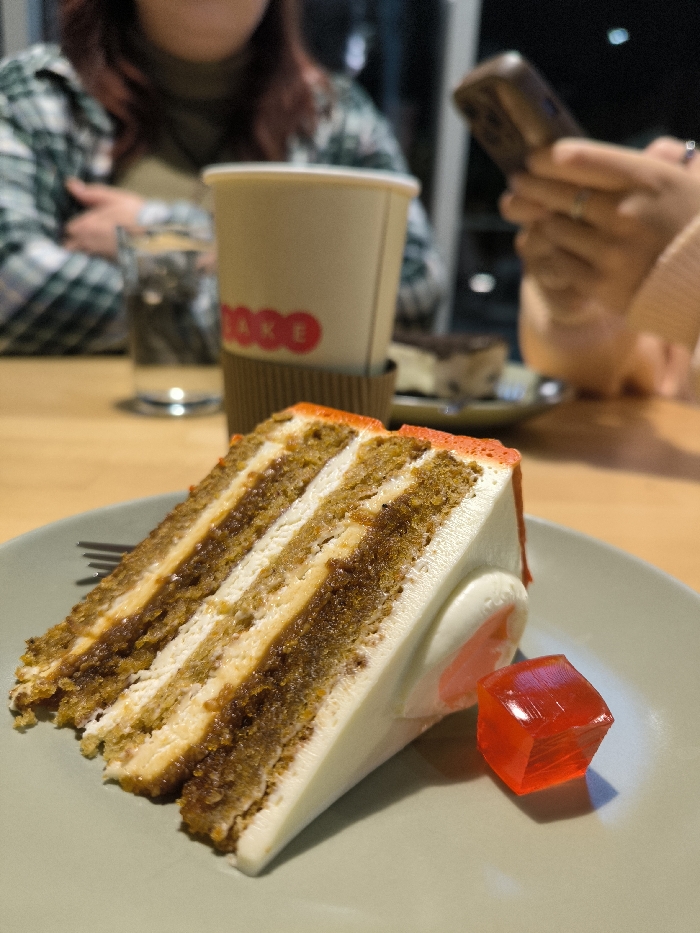 The image depicts an indoor scene within a cafe or restaurant in Vinnytsia, Ukraine. In the foreground, a slice of layered cake is presented on a light-colored plate. The cake consists of four dark brown cake layers and three distinct white or cream-colored frosting layers, with an orange-red topping along its upper and side edges. Adjacent to the cake on the plate is a single, translucent, reddish-orange cubic jelly candy. A metal fork is partially visible to the left of the cake. Behind the plate, on a light-toned wooden table, a disposable beige paper cup with a brown corrugated sleeve is visible, bearing a red logo that appears to show "OOD." To the left of the cup, a clear glass filled with water is present. In the blurred background, two individuals are seated at the table. The person on the left wears a green and white plaid shirt over a dark top, with reddish-brown hair, and their arms are crossed. The person on the right is depicted holding a dark-colored smartphone with both hands; a silver ring is visible on one of their fingers. Further back, another dessert item, possibly a slice of cheesecake, is visible on a plate. The overall lighting suggests an evening or dimly lit environment.