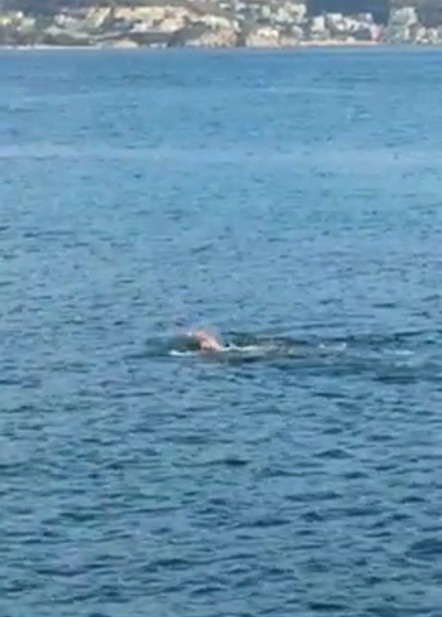 person swimming in the ocean. The water is blue and calm. In the background, there are hills and buildings on land. The swimmer is wearing a dark swimming cap and appears to be doing freestyle.