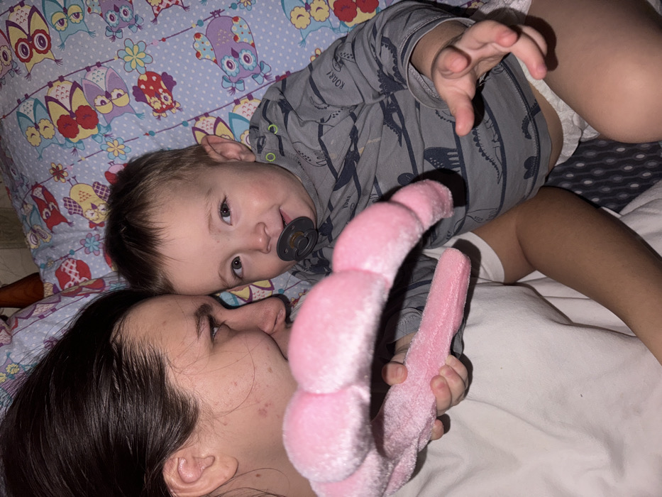 - "A woman with dark hair lies next to a baby" by FM-j2hvk2, licensed under CC BY 4.0