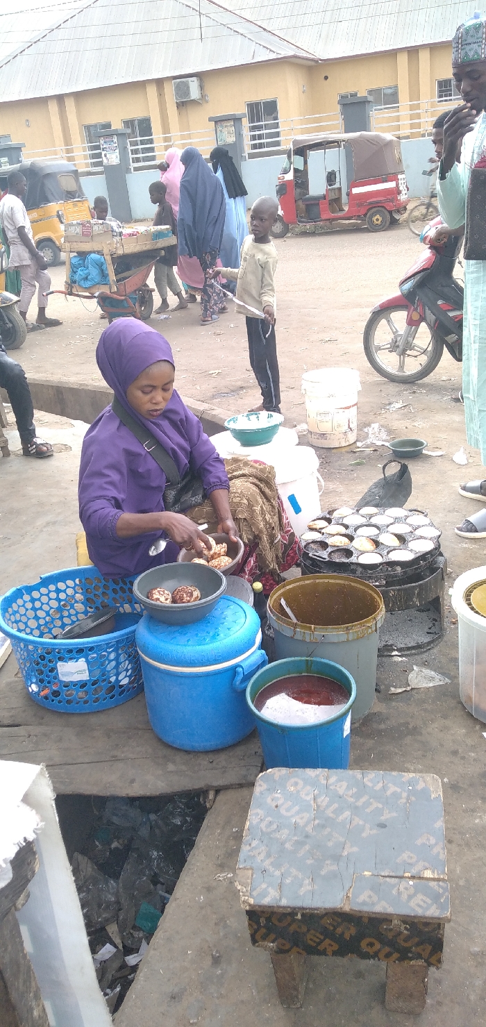 - "A woman in a purple hijab and jacket fries small cakes on a hot plate, seated among blue plastic containers and a basket" by FM-Vamwy2, licensed under CC BY 4.0
