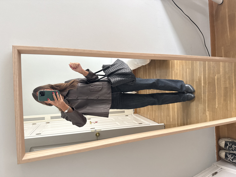 An indoor scene is depicted within a residence in the city of Unknown, Unknown. The primary subject is a female, seen reflected full-length in a vertical, light wood-framed mirror, approximately centered in the frame. She holds a smartphone with a dark green case in her right hand, obscuring her face, as if taking a selfie. Her left arm supports a black woven leather tote bag. She wears a dark brown collared leather jacket with button closures and two lower front pockets, dark-wash straight-leg jeans, and black pointed-toe footwear. A silver-toned wristwatch is visible on her left wrist, and red nail polish is present on her visible fingers. The reflected background includes light-toned parquet wooden flooring, white walls, and a white paneled door with a brass-colored doorknob on the left. A portion of a bed with white bedding is visible on the right. A pair of black Converse sneakers are present on the wooden floor in the bottom-left foreground, outside the mirror's reflection.