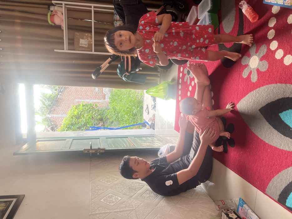 The scene depicts an interior residential space in Kecamatan Pati, Indonesia, with an open doorway leading to an exterior area. Three individuals are present inside. On the left, an adult male, wearing a black short-sleeved shirt with a white "9" logo and dark pants, sits on a red patterned rug. He faces right, with both hands positioned near an infant who is crawling on the same rug. The infant wears a light orange or brown outfit and is on its hands and knees, appearing to move forward. The male's bare feet are visible. To the male's immediate left, against a white wall with decorative square tiles, rests a clear plastic bottle and a package of wipes. On the right side of the image, a young girl, estimated to be between 4 and 6 years old, stands barefoot on the red rug. She wears a red short-sleeved, short-legged pajama-style outfit with white cloud patterns. Her hands are held close to her chest. To her right, a white multi-tiered shelving unit holds various objects, including a pink item on the top shelf and a cardboard box on a lower shelf. Behind the girl and the shelving unit, a dark-colored baby stroller or pram is visible. A translucent green plastic container is on the floor near the doorway. Another red plastic bottle lies on the rug to the girl's right. The open wooden door, painted a light green or blue, reveals a bright outdoor environment. Sunlight streams into the room, creating distinct shadows. The exterior features lush green vegetation, a partial view of a reddish-brown brick building, and a ground surface with visible footwear (sandals/slippers). The interior floor is light-colored tile around the rug, and a brown curtain hangs to the right of the doorway.
