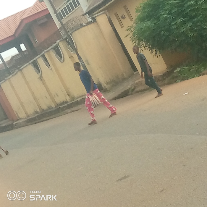 Two young men walk on an asphalt road flanked by buildings and foliage. One is closer, wearing a blue shirt and patterned pink pants, with a bag slung over his shoulder. The other is farther away, dressed in darker colors. The buildings appear aged, with cream-colored walls. A house with a red roof is visible. The road slopes upward into the distance. A "TECNOSPARK" watermark is present at the bottom of the image.