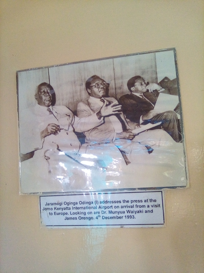 A rectangular, horizontally oriented photograph, appearing to be a black-and-white or sepia print, is mounted on a plain, light-colored wall, possibly beige. The photograph is covered by a reflective, transparent material, causing glare across its surface. Below the photograph, a white caption card with black text is attached. The photograph depicts three adult males seated side-by-side, appearing to be in an indoor setting with a paneled background. From left to right: 1. **Jaramogi Oginga Odinga:** An older man, wearing a light-colored suit, collared shirt, and tie. He looks towards the viewer's left with his mouth slightly open, holding a pair of glasses in his left hand. 2. **Dr. Munyua Waiyaki:** A man wearing a suit, collared shirt, and glasses. He looks towards the right, with his right hand raised and open, gesturing. Papers are visible in his lap. 3. **James Orengo:** A man wearing a dark suit, collared shirt, and glasses. He looks down at papers held in his lap with his left hand, while his right hand holds a pipe near his chin. The caption beneath the photograph reads: "Jaramogi Oginga Odinga (l) addresses the press at the Jomo Kenyatta International Airport on arrival from a visit to Europe. Looking on are Dr. Munyua Waiyaki and James Orengo. 4th December 1993." This image, comprising the photograph and its caption, is located in South Sakwa ward, Kenya.