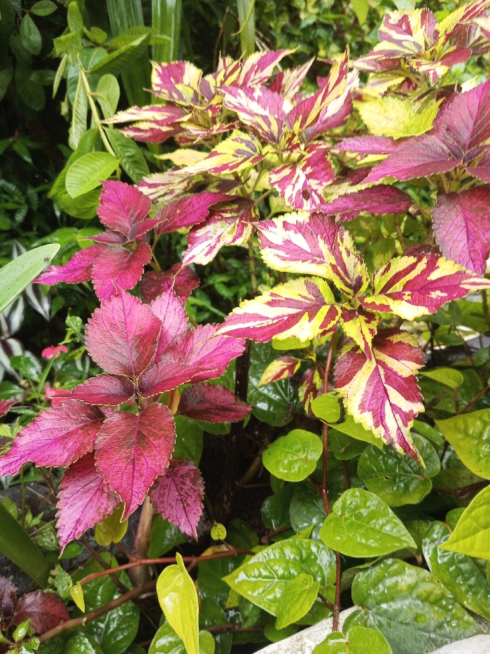 A vibrant close-up showcases coleus plants with striking foliage. Leaves display a mix of colors: some are predominantly magenta with subtle hints of green, while others boast a striped pattern of magenta, yellow, and cream. Green foliage surrounds the coleus, with small, heart-shaped leaves adding texture to the lower portion of the frame. The leaves appear freshly wet, adding a glossy sheen.