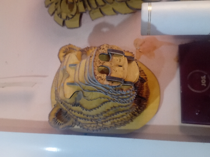 A layered wooden tiger head sculpture rests on a white surface. The tiger's features are carved and stacked, creating a textured appearance. Parts of a golden flower-like object are visible in the upper left corner, behind the tiger. A white cylinder with gold accents and a dark red box labeled "JOS" are positioned to the tiger's right, partially obscuring the background.