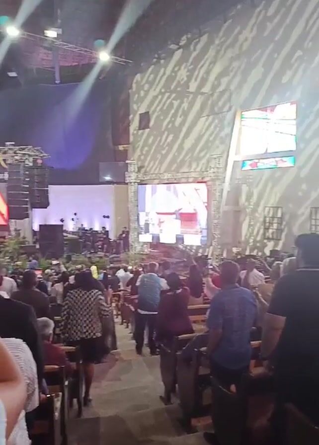 n indoor event, likely a church service or concert, from the perspective of someone in the audience