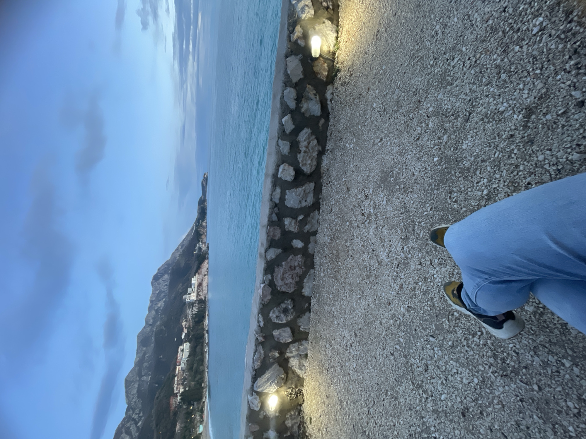 The scene depicts a first-person view of a coastal twilight environment in Kamenovo, Montenegro. The lower half of a person is visible in the foreground, wearing light blue jeans and sneakers, with legs crossed at the ankles. The person is situated on a surface covered with light-colored, coarse gravel. A stone wall, constructed from irregularly shaped, light-colored stones mortared together, extends horizontally across the mid-foreground. Two upward-facing, artificial lights are mounted on this wall, emitting bright yellow-white illumination onto the gravel and the wall itself. Beyond the wall, a calm, turquoise-blue sea extends to the horizon. Along the coastline to the left, a sandy or pebble beach is visible, backed by a settlement of multiple white and light-colored buildings nestled into the foothills of prominent, dark-ridged mountains. The sky above is a deep blue, transitioning to lighter hues near the horizon, with scattered grey cloud formations. A distant landmass or headland is visible on the far right where the sea meets the sky.