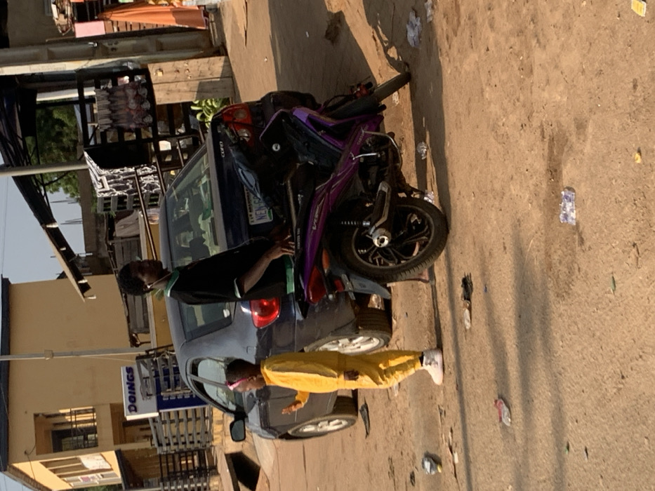 The image depicts a daytime street scene in Aguleri, Nigeria, characterized by a dry, dusty dirt ground with scattered litter including plastic bottles and wrappers. In the foreground, a dark blue sedan, appearing to be a Subaru, is parked facing away from the viewer, displaying a "NEW-604" license plate. A purple motorcycle, equipped with a kickstand, is parked in front of the car, angled slightly to the right. An adult male stands between the car and the motorcycle, partially obscured by the latter. He wears a black short-sleeved shirt with a green collar and wired earbuds, looking towards the right. To the left of the adult male and in front of the car's rear driver-side wheel, a young child, dressed in a yellow long-sleeved tracksuit and white sneakers with a pink headband, stands facing left with their right hand raised, palm open. In the background, a two-story light yellow building with windows is visible on the left, featuring a white sign with "DOINGS" in blue text on its lower level. Further to the right, behind the parked vehicles, are less defined structures, possibly commercial stalls, displaying various items. The sky overhead is clear blue, and strong sunlight creates distinct shadows, indicating a bright day. No direct interaction is evident between the two individuals.