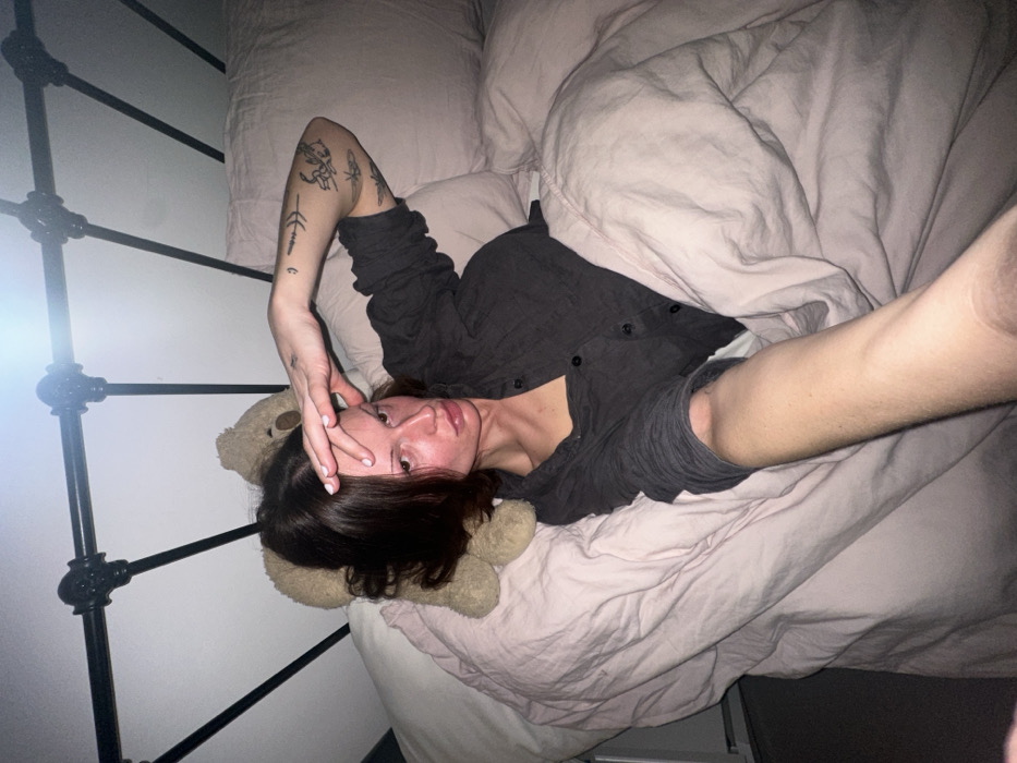 A woman with brown hair lies on a bed with a teddy bear. She wears a dark grey shirt and has tattoos on her left arm. Her hand is near her face, and she appears to be taking a selfie. The bed has a black iron frame on the left side. The bedding is light pink, and the overall lighting is dim.