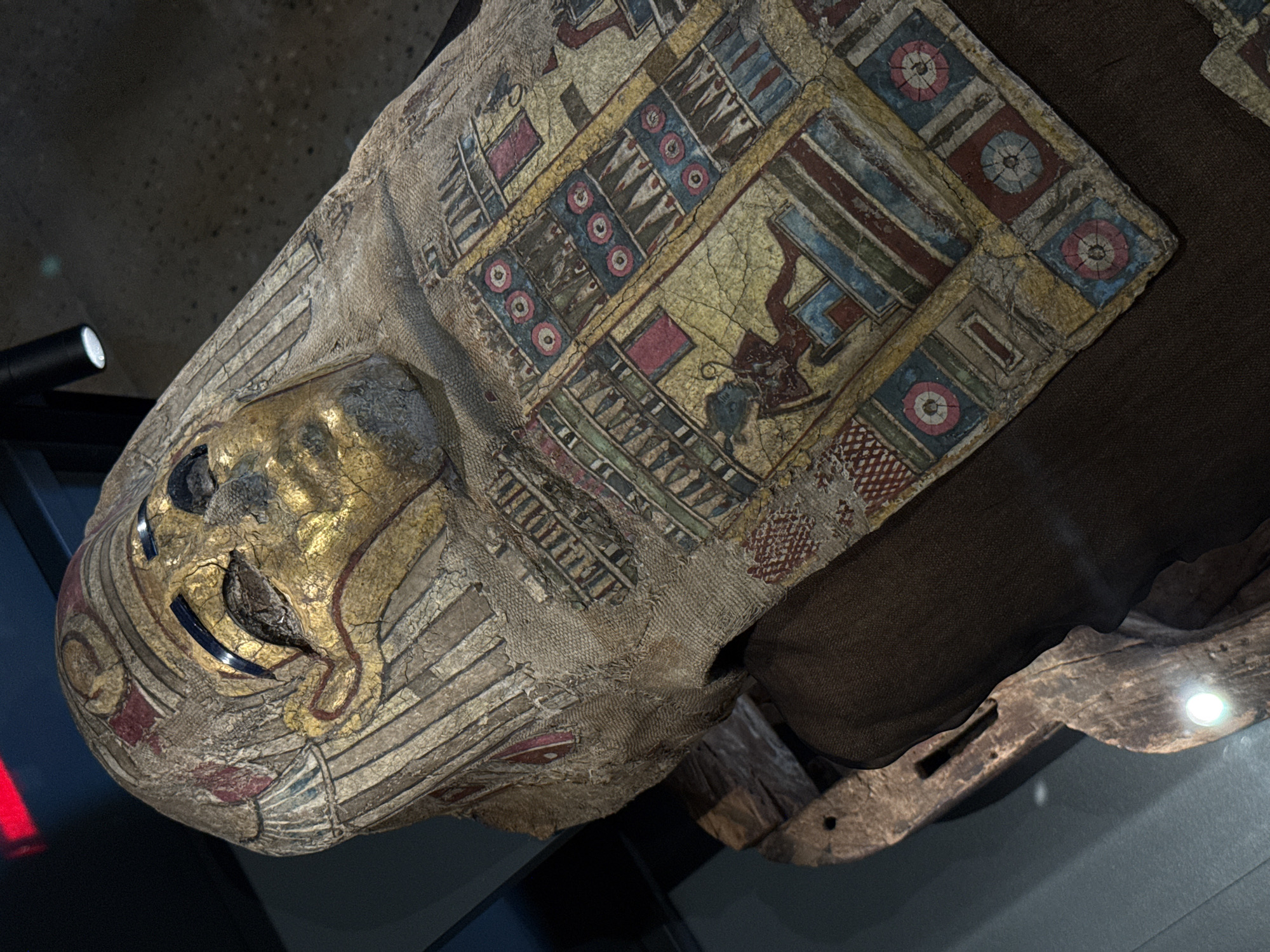 An angled, eye-level close-up shows an Egyptian mummy