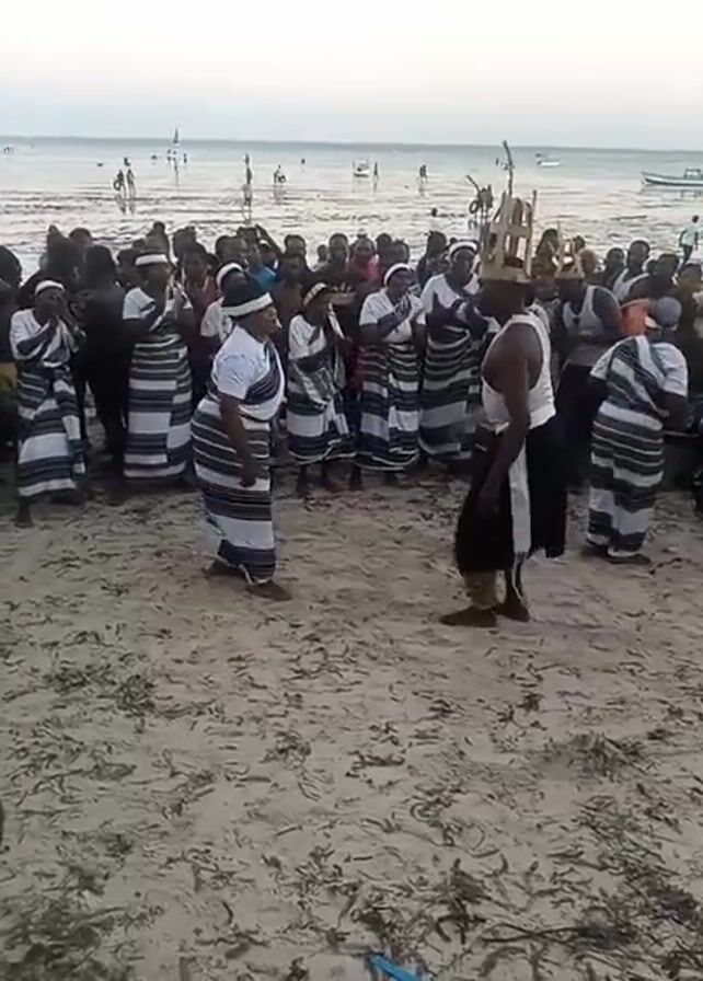 A group of people are gathered on a sandy beach near the ocean. Many are wearing matching striped white and black outfits, while some are in other clothing. At the center, a man wearing a simple white tank top, a black wrap-around garment, and a distinctive headdress made of twigs or reeds is engaged in what appears to be a ritual dance with a woman in a similar striped outfit. The group is arrayed around them, clapping and watching. The ocean is visible in the background, with a few small boats and people standing in the shallow water. The sky is somewhat overcast.