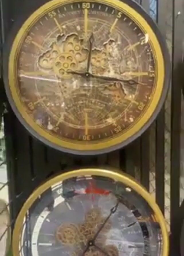display of decorative clocks. The clocks are round and have visible gears inside. The clock faces feature artistic designs, including world maps. The clocks are mounted on a dark metal grid wall. The scene is indoors and appears to be in a retail setting.