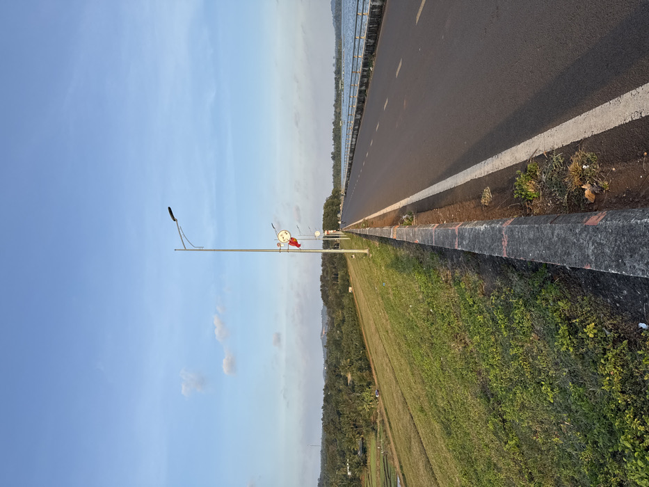 The image displays an elevated asphalt road in Thôn 1, Vietnam, under a clear, light blue sky with scattered white clouds. The two-lane road features a continuous white line along its left edge and dashed white lines marking the center, extending into the distant horizon. A concrete curb, marked with some red, separates the road from a downward-sloping grassy embankment on the left. Beyond this embankment, dense green vegetation, possibly agricultural land and trees, is visible, leading to distant hills. Multiple silver streetlights are spaced along the left side of the road, each adorned with a small red Vietnamese flag and a circular white sign, some depicting a smiling face. To the right of the road, a metal railing borders a large body of water exhibiting surface ripples. Several indistinct human figures, including one on a bicycle, are visible in the far distance along the road.