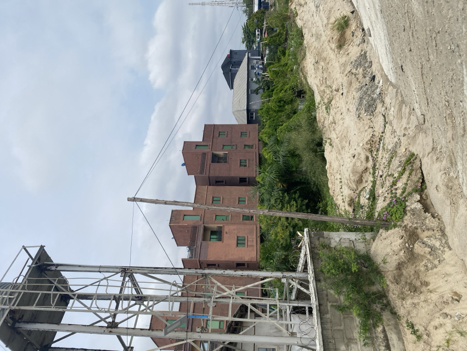 The image depicts an outdoor urban landscape in Alaguntan, Nigeria, under an overcast sky with scattered white and grey clouds. In the foreground, an uneven expanse of light-colored sand, mixed with darker soil and small rocks in some areas, occupies the lower right portion of the frame. Small green plants, some bearing purple flowers, grow intermittently on the sandy terrain. To the immediate left, a concrete block wall, approximately waist-height, is visible, topped with multiple coils of barbed wire. Behind this wall, a tall, white or light-colored metal lattice structure, possibly a water tower or a smaller transmission tower, stands vertically, with a blue-hued solar panel attached to one of its lower legs. A single weathered wooden utility pole rises centrally from the sandy ground, extending upwards beyond the frame. The midground features a dense belt of verdant trees and shrubs, acting as a natural buffer. Multiple black utility wires stretch horizontally across the scene, connecting to the wooden pole and extending towards the background. In the background, positioned above the dense vegetation, a complex of at least two connected multi-story buildings with reddish-brown brick or rendered facades is prominent. These structures exhibit a modular design with rectangular projections, numerous green-framed windows of varying sizes, and several small balconies. Blue satellite dishes are visible on the flat roofs of these buildings. To the right of this complex, a grey-roofed house with grey walls is discernible, and further right, another darker building with a pointed black roof can be seen. In the far distance, a tall, slender lattice communication tower is visible against the sky. No individuals are present within the depicted scene.