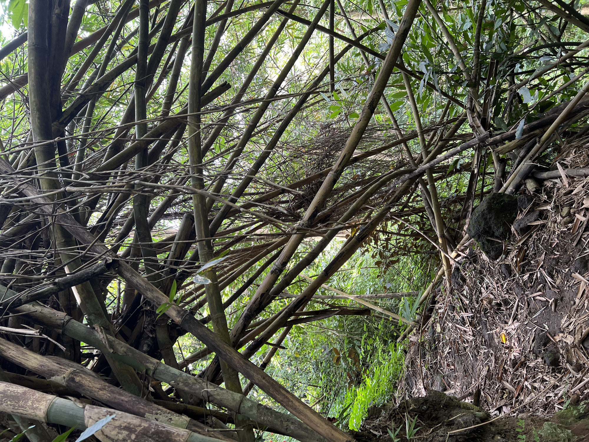 dense bamboo grove in Bengkel, Indonesia. The bamboo stalks are of varying sizes and colors, ranging from green to brown. They crisscross each other, creating a complex network of lines. On the right side of the image, there is a steep embankment covered with soil and fallen bamboo leaves. Green foliage can be seen in the background, suggesting a lush, tropical environment. The lighting is diffused, creating an overall sense of enclosure and depth.