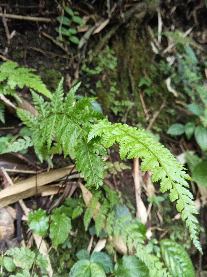 A close-up shot depicts a vibrant green fern frond extending diagonally from the lower-left to the mid-right of the frame. The frond exhibits intricate pinnately compound leaves, with the younger growth at its tip appearing a lighter shade of green. The fern originates from a densely vegetated ground cover that includes dark, moist soil, scattered brown leaf litter, fragments of dried bamboo or wood, and various smaller green plants, including mosses and other ferns. The background is out of focus, reinforcing the depth of the forest floor environment. No human subjects, animals, or artificial objects are present. The scene represents a natural, undisturbed botanical setting consistent with a rainforest or dense jungle area in the vicinity of Bangalum Bridge, Papua New Guinea.