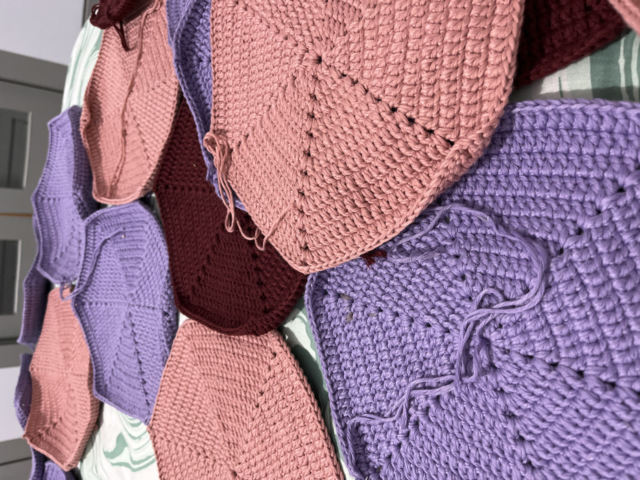 Multiple crocheted fabric pieces are displayed across a patterned surface in a domestic setting within Lhokseumawe, Indonesia. The pieces, predominantly in shades of pale pink, lavender, and deep maroon, are flat, mostly polygonal or irregular in shape, and exhibit a consistent crochet stitch pattern. Several pieces have visible loose yarn strands, indicating they are either unfinished or awaiting further assembly. These textile items are arranged in an overlapping configuration on a light green and white striped or marbled fabric, likely a bedsheet or tablecloth. The background is out of focus, revealing blurred light-colored furniture elements, possibly a wardrobe or cabinets, suggesting an indoor environment. No individuals or active processes are depicted in the scene.