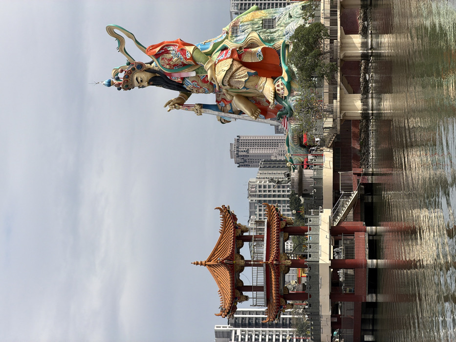 A vividly colored statue of a deity holding a sword stands above a traditional Chinese pagoda reflected in water. Behind, urban high-rise buildings are visible against a cloudy sky. Staircases and a structure appear along the waterfront, adding architectural elements to the scene, suggesting a blend of nature and urban development.