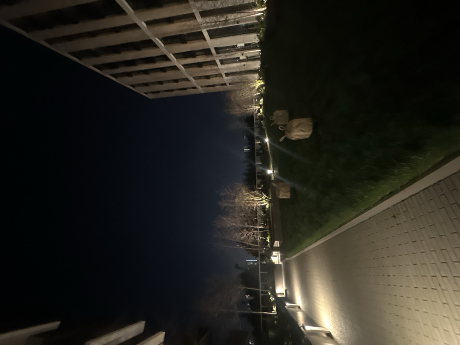 The image displays a modern, artificially lit outdoor landscaped area at night, located within the city of London, United Kingdom. A light-colored paved pathway, constructed from rectangular bricks in a stretcher bond pattern, extends diagonally from the lower-left foreground into the midground. This pathway is illuminated by multiple recessed ground-level lights spaced along its left edge. To the right of the pathway, a manicured green lawn slopes gently upwards, bordered by a concrete curb. Three light-brown, sack-like objects, each featuring two rounded protrusions on their upper surface, are positioned on this grassy slope. In the midground, several bare deciduous trees with slender trunks are visible, illuminated by uplights from their bases. A multi-story building with a light-toned, vertically-aligned facade and numerous windows occupies the right side of the frame, extending from the midground to the upper right. Portions of this building are illuminated by exterior lights. Another building or structure is partially visible on the far left. The sky is dark, indicating nighttime conditions, with distant urban lights faintly visible on the horizon. The environment appears clean and well-maintained. No individuals are present in the scene.