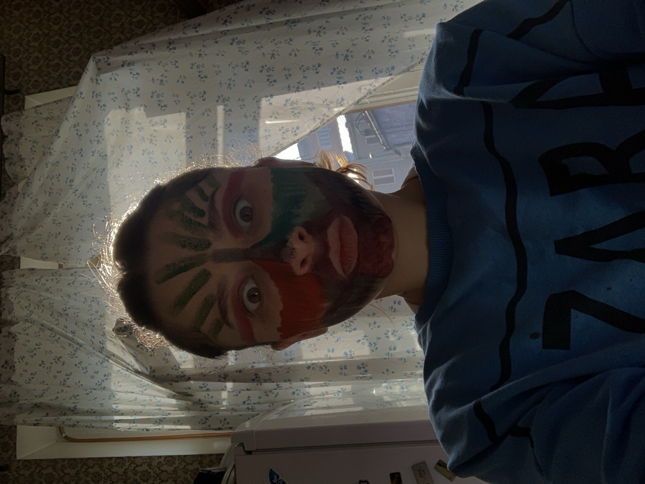 An individual is depicted in an indoor, front-facing selfie taken in Yerevan, Armenia. The subject, likely an adult, is positioned centrally and photographed from the chest up. Their face is covered with multi-colored paint: green linear strokes across the forehead, red paint around the viewer's left eye and cheek, dark blue/green paint around the viewer's right eye and cheek, a darkened nose, and dark red/brown paint extending from the lower lip, resembling a beard, while the mouth is pursed. The eyes are wide open, directed at the camera. The individual is wearing a blue long-sleeved sweatshirt with black horizontal stripes and the partial inscription "ZARA" visible on the front. Behind the subject is a window draped with semi-sheer, light-colored curtains featuring a repeating light blue floral pattern. To the viewer's left, a portion of a white appliance, consistent with a refrigerator, is visible. Beyond the window, urban residential buildings with light-colored facades are discernible under a bright sky, characteristic of Yerevan. A light-colored rooftop is also present in the exterior view. Strong backlighting from the window creates a halo effect around the subject's head and illuminates the curtains, while casting the foreground into partial shadow.