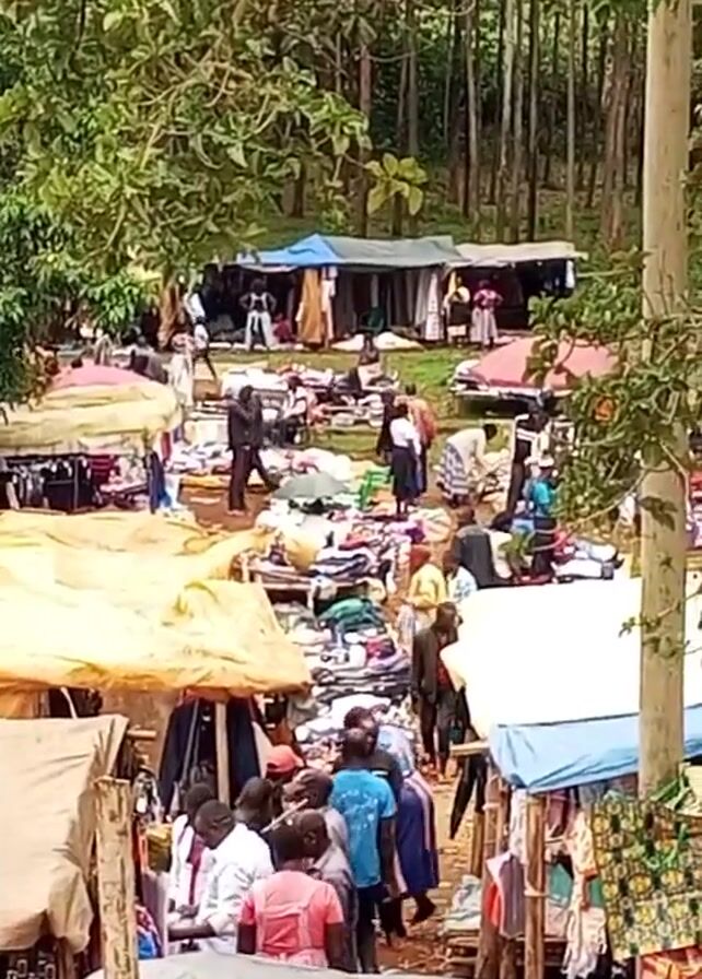 busy outdoor marketplace with many vendors and shoppers. The market is set up in a somewhat open area surrounded by trees. Stalls and tables, some covered with makeshift awnings, display goods like clothing. People are milling around, browsing, and presumably buying and selling items. The camera zooms out slightly to reveal a blue corrugated roof in the foreground, suggesting the video is taken from an elevated position overlooking the market.