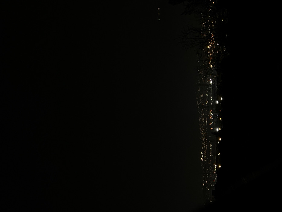 The image displays a wide, dark nighttime panoramic view of an urban or suburban area within the Anthousa Municipal Unit, Greece. The upper two-thirds of the frame consists of a deep black night sky. The lower portion reveals a sprawling network of diffused artificial lights, appearing as yellow and white points, indicating buildings and infrastructure across an undulating landscape. The lights extend horizontally across the scene, suggesting a considerable distance from the viewer. The immediate foreground is obscured by darkness, with faint, dark silhouettes consistent with leafless tree branches visible on the far right edge of the frame. No individuals, vehicles, or specific actions are discernible. The scene is static and devoid of human interaction.